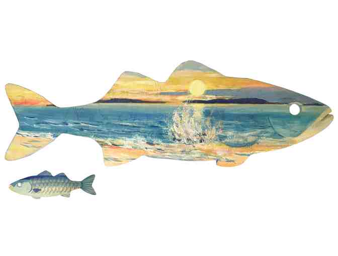 Description: Each morning as I walk to the sunrise I am reminded of the beauty of where we live. Sunrise as seen from Lynch Park is different. As different as a snowflake. The call of the sea. The smell, sounds, mystery, history. This connection with place and time is the inspiration for Sunrise Striper. The base layer on the front of the fish is a collage of old Beverly maps and copies of letters that my father sent home to his parents in Beverly, while he served in the Navy in WWII. The letters felt to me, like a love letter connection to the past, the sea, the world and also a nod to the idea of a message in a bottle. Patterns of the waves, sand, architecture, trees, clouds also interest me for their history, for their interest and their nod to craft. I created a stencil of an oversize Striper scale to use on the front and the back of the fish as a layer of texture. The texture helps the colors to glisten in the sun. The sunrise and splash from April 7, 2021 is reflected on the front of the fish.