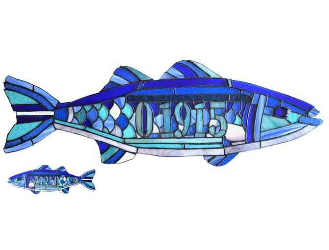 Description: This piece, The Glass Bass, was inspired by the colors of the ocean steps from where we live. The use of stained glass as a medium allows for the colors to be reflected even more as the light filters through. The subtleness of the zip code gives a nod to our hometown of Beverly. As an artist I very much enjoy working with stained glass and the creativity it allows through color and shape. This artwork consists of 116 individual stained glass pieces and can be hung up as there are hooks on the back of it or could be placed on a stand.