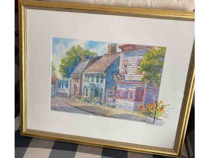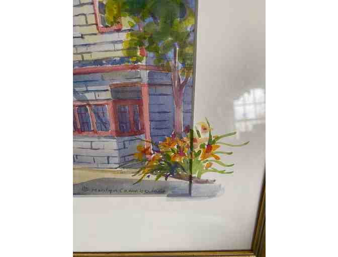 WATERCOLOR PRINT. 16 x 13 IN INCHES. NOTE ORIGINAL WATERCOLOR DETAIL ON MAT HAND PAINTED BY LOCAL ARTIST, MARILYN CHAMBERLAIN