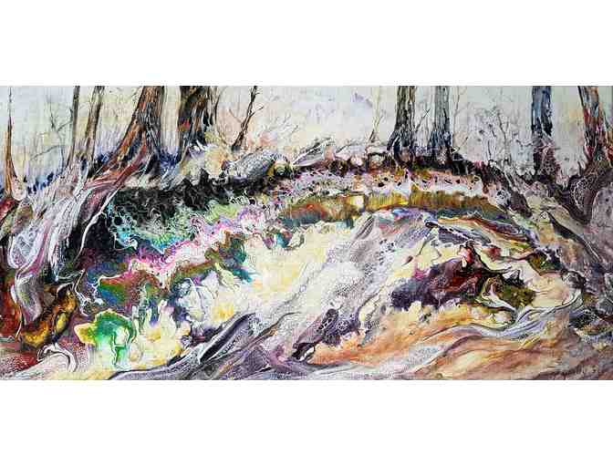 'The Dunes' is an acrylic pour painting on 12x24 canvas which the artist then transformed with her paintbrush to create this spirit filled painting.