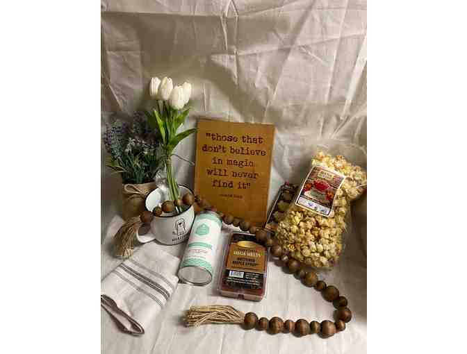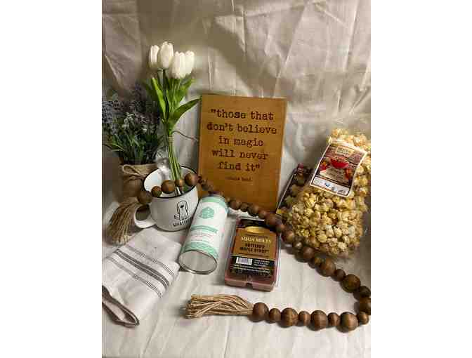 This basket has all of your favorite 'feel good' items. Complete with lovely decorations for your home, sweet smelling candle melts and tasty treats! The perfect basket for yourself or a loved one.