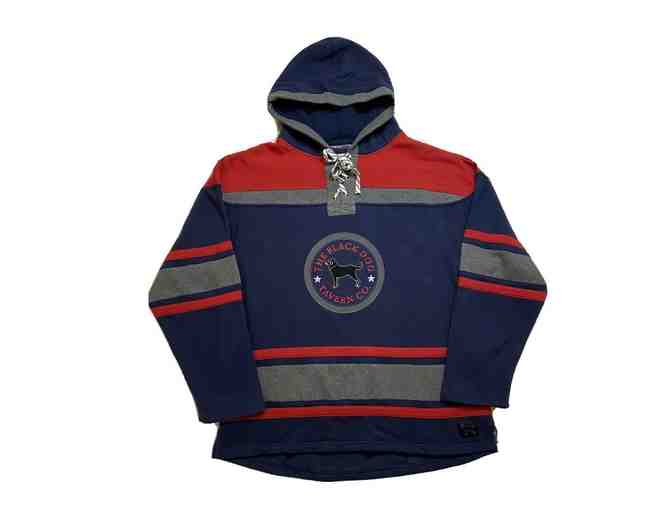 BLACK DOG CLASSIC HOCKEY HOODIE. MENS SIZE LARGE. BLACK, NAVY AND RED. HEAVYWEIGHT 80 PERCENT COTTON, 20 PERCENT POLYESTER. SOLD OUT!