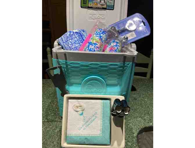 TIFFANY BLUE (18 CAN) COLEMAN COOLER, PORCELAIN NAPKIN HOLDER WITH (DISCONTINUED) RARE HOCKEY SKATES DETAIL, WINE OPENER, LILY PULITZER TRAVEL WINE GLASSES, MARBLEHEAD NAPKINS AND STANLEY CUP BEER OPENER, AND MHEAD BEACH TOWEL!