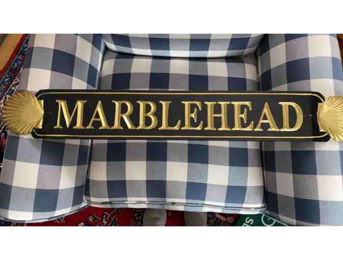 BLACK MARBLEHEAD QUARTERBOARD. 3 FEET LONG, WITH SHELLS ON ENDS. MADE LOCALLY.