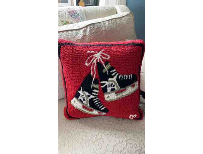 HOCKEY SKATE PILLOW. RUG HOOKED. 18” BY 18”, VELVET BACKED