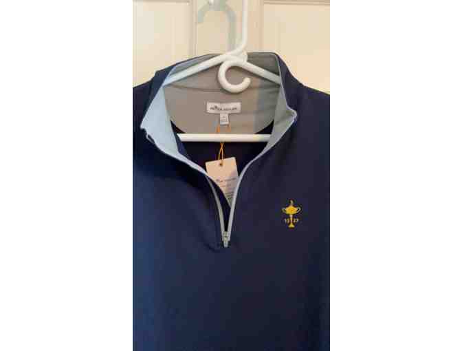 PETER MILLAR NAVY,QUARTER ZIP, RYDER CUP TROPHY 2020-21, MENS LARGE LONGSLEEVE PULLOVER. (Material: 89% Polyester/11% Spandex, Olympic collar, Lightweight jacket suitable for mild temperatures, Machine wash, tumble dry low).
