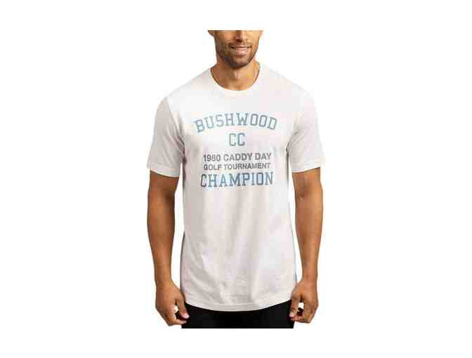 TRAVIS MATHEW MENS SIZE MEDIUM SHORT SLEEVE T-SHIRT. CADDYSHACKS BUSHWOOD CC 1980 CADDIE DAY. ONE AVAILABLE TO EACH OF THE TWO HIGHEST BIDDERS. 100% PIMA COTTON, OFF WHITE