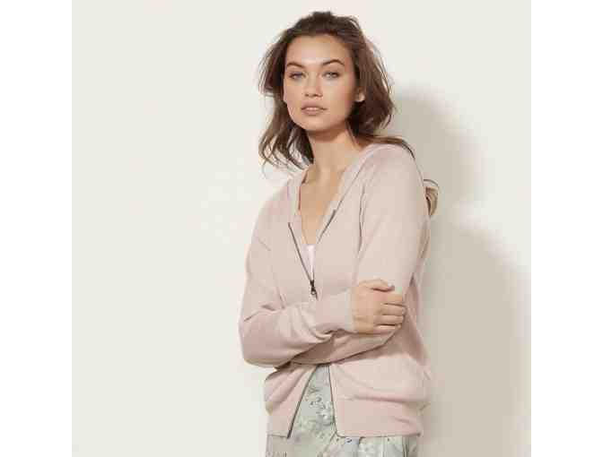 This 100% cashmere, zip hoodie is perfect for the effortless California lifestyle. Approachable, timeless fashion, created with attention to detail, from the finest fabrics. It's a beautiful seashell pink in size small.