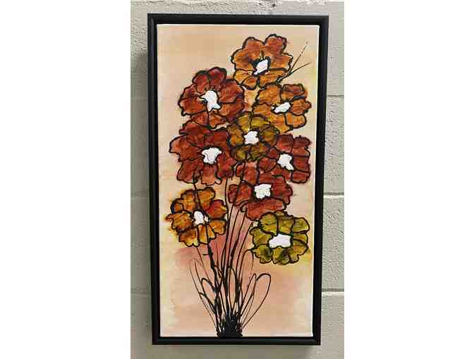 Acrylic on Canvas in a Floating Frame, wired and ready to hang.