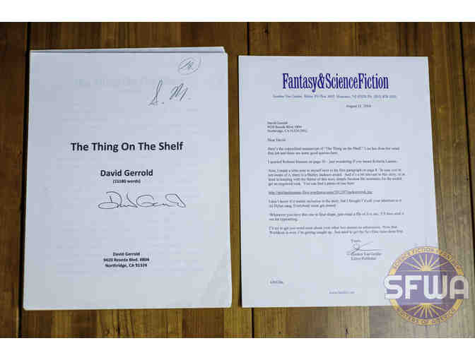Marked-up manuscript of "The Thing on the Shelf" by David Gerrold, including editor's letter from Fantasy & Science Fiction. Manuscript signed by the author.