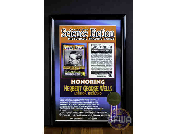 One of a kind framed print of the H.G. Wells trading card from The Walter Day Collection. This was the very first card released in this collection, which commemorates the history and culture of the science fiction genre as found in art, film, and literature. The print was presented on January 17, 2015 at Arcade Expo and is signed by Eric Tessler, Kenny Hardy, Mark Hoff, John Weeks, Billy Mitchell, Natalie Rossetti, Dave Danzara, Walter Day, Erin Cavanaugh, and Dan Cerny.