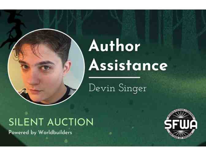 Ever wondered how an author's assistant can help you as a writer? Devin Singer is an experienced author's assistant and will help the winning bidder with two hours of services in areas such as workflow/processes for managing tasks or social media and strategies for managing social media or moderating comment threads. Singer is also willing to spend time doing data entry or setting up a newsletter or Discord or whatever might be helpful.