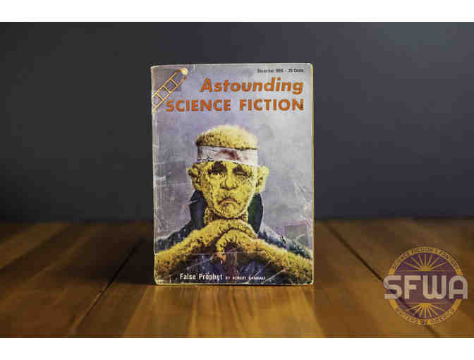 Copy of Astounding Science Fiction, December 1956. Contains story "False Prophet" by Robert Randall and part 3 of the original publication of Isaac Asimov's The Naked Sun. Note: cover is creased and binding bound together with tape.
