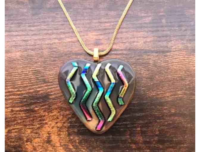 The pendant is adorned with a special chevron pattern using uniquely colored dichroic glass. In different light, the dichroic glass will almost change colors before your eyes. This heart shaped pendant is absolutely a statement piece, measuring 2.5” wide and 2.5” tall. Chain is 18” long.