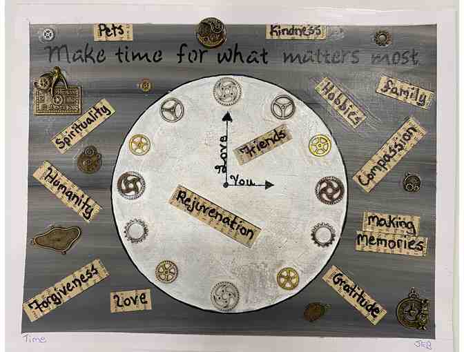 Acrylic on heavy weight, acid-free paper with metal gears and newsprint
