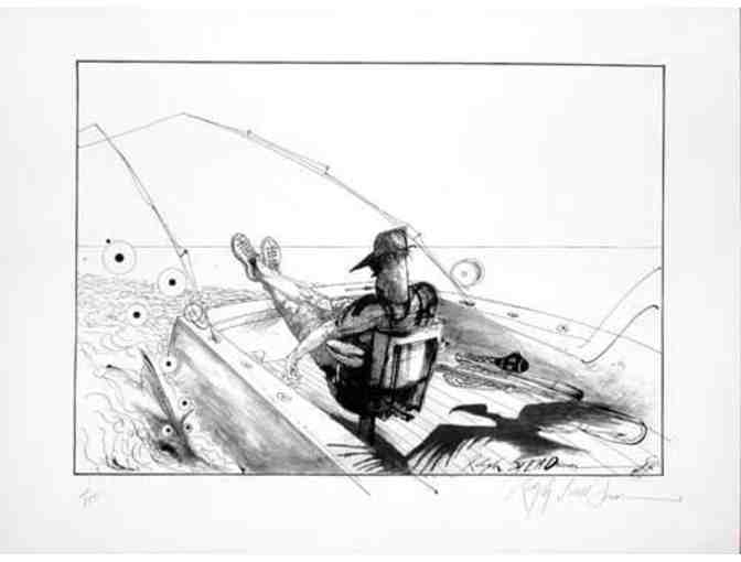 This signed Ralph Steadman print is the image of Hunter S. Thompson asleep in a fishing boat chair with the shadow of a vulture creeping up from behind and a shark lurking in the waters below. An image from Steadman's 2006 book "The Joke's Over," a memoir of his friendship and collaboration with famed Gonzo Journalist Hunter S. Thompson. The "Joke's Over" prints cover the span of their association, from their first meeting in Kentucky to the 2005 memorial service at which Thompson's ashes were blasted out of a cannon and include work from "Fear and Loathing in Las Vegas," "The Curse of Lono," and "The Kentucky Derby is Decadent and Depraved," among many others. One-color silkscreen on white Rising Stonehenge deckle edge paper measuring 22 x 30 inches.