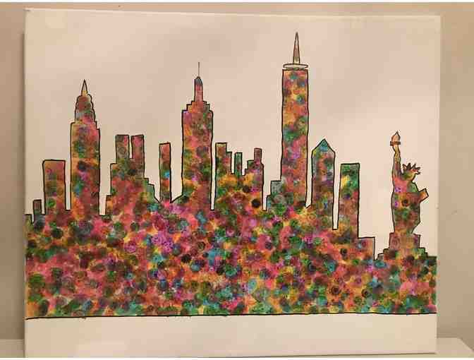 First graders contributed to this group art project by helping to dot paint our beautiful city skyline.