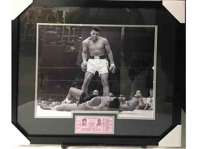 MUHAMMAD ALI- this unsigned professionally framed 16x20 photograph of Ali over Liston comes with a replica ticket from that fight.