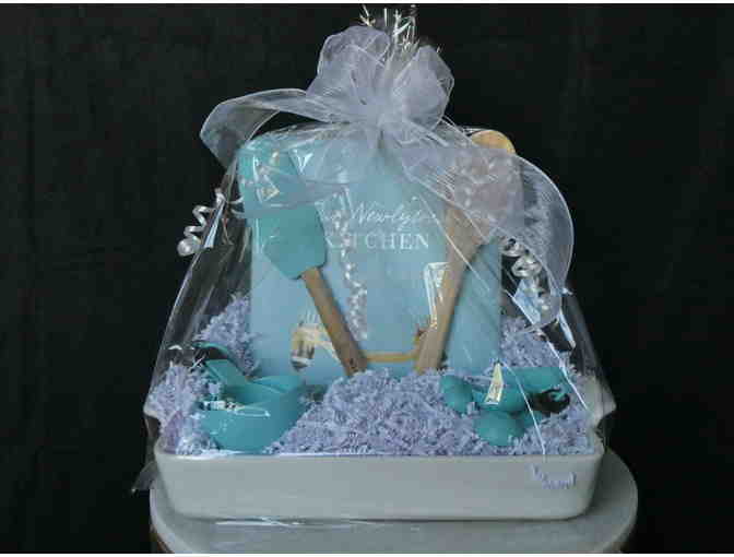 This gift basket makes a wonderful shower or bridal gift for the newly engaged or newlywed couple. This gift basket includes "The Newlywed Kitchen" book by a local Tennessee author (Laura Schupp) along with measuring cups, wooden spoon, spatula, and a ceramic casserole dish.