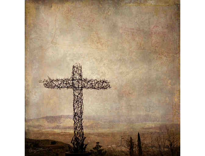 “Cross of Nails” was created in Jerome Arizona. The image was created by adding five additional layers of texture overlayed over the image, and then printed on real maple wood. The beauty of the grain comes through on the lighter colors and white areas of the image giving it a soft and warm feel.