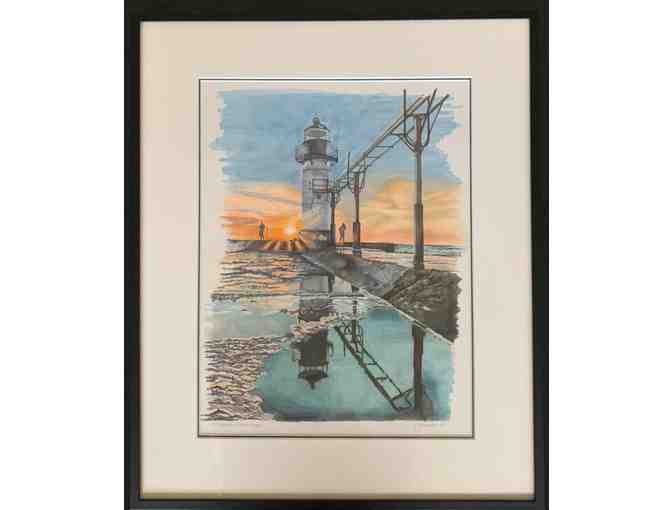 Made by Michigan artist Julie Coronado, this framed and matted piece captures the beauty of the St. Joseph North Pier Outer Lighthouse at sunset. The scence depicts a fisherman and sunwatcher at sundown and measures 18.25" x 22.25".