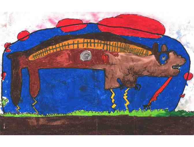 This is a copy of oil pastel on paper that Keiran did when He was in grade 3. The original is 11x14. His teacher wanted them to learn about Noval Morrisseau's art, and she taught them about colour, lines, and the images he used.