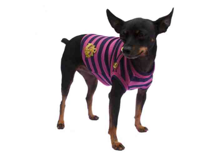 Cuteness abounds! This sweet dog outfit by LoveBarks can be yours! The "Sailor T-Paw" is purple and navy stripes with gold buttons and a gold embroidered anchor. It is a size Medium and will fit a dog approximately 15-20lbs.