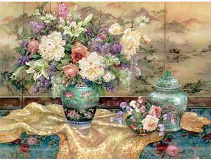 "Oriental Splendor" is a richly complex work that features a lavish bouquet accented with elegant oriental vases and bowls. A lush, goldne jacquard linen and a colorful floral tablecloth ground and unify the composition. These sumptuous patterns are a perfect accompaniment to the tranquil landscape painting on the oriental screen that provides an ethereal backdrop for this piece.