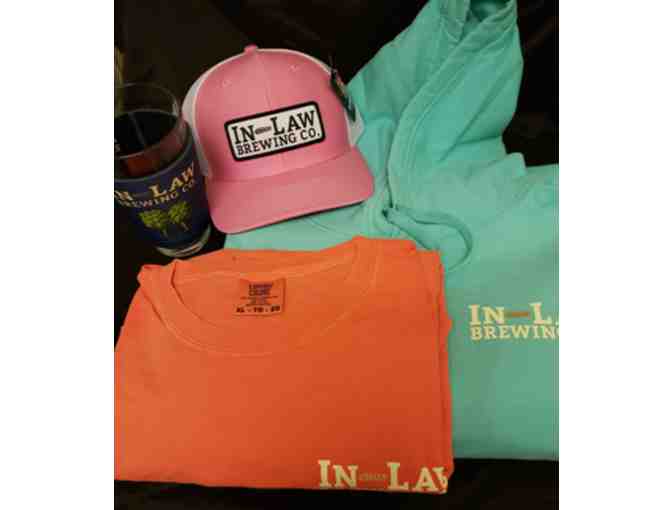 In Law Brewing has quickly become a local favorite. Show how much you love their beverages...by sporting their apparel! This gift pack comes with an XL aqua hoody, XL coral t-shirt, pink baseball cap and pint glass and coozie. Enjoy!