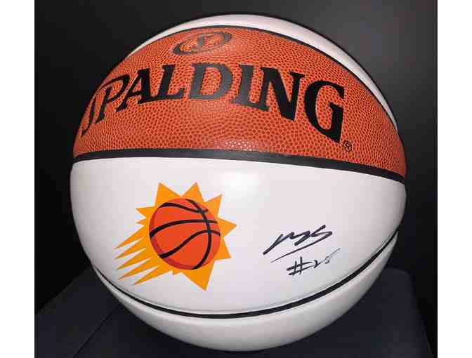 Bid now to win this Spalding basketball autographed by Suns guard Mikal Bridges. The basketball is leather with white signature panels and the Suns logo.