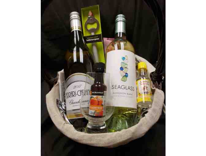Enjoy white wine? Then you need to bid on this basket! It includes 2017 Ferraro Carano Chardonnay, SeaGlass Sauvignon Blanc, a stainless steel bottle opener, small DeKuyper Peachtree Schnapps, Admiral Nelson Pineapple Rum, glass and a $20.00 Orvis Street Discount Wine and Liquor Gift Certificate.