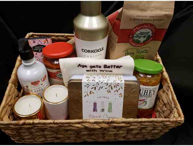 This gift basket is full of lots of goodies! You'll get imported Italian Pasta and Montebello Verdura Sauce, Suhey Peppers, a Corkcicle Canteen, Thymes Hand Creme Trio, Seattle Chocolate and more! Bid and make this basket yours!