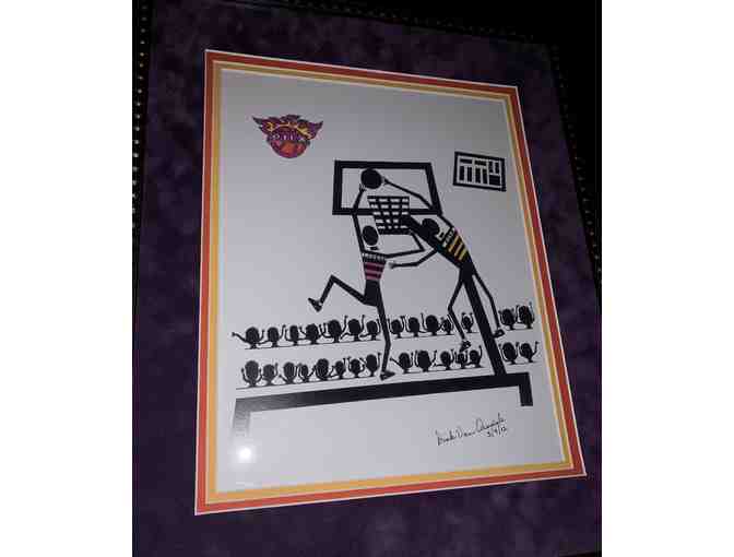 Bid now on this original drawing from Suns Legend Dick Van Arsdale. This beautifully framed, color drawing from 2012 shows a scene of a Suns player and a Lakers player in front of a cheering crowd.