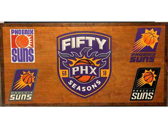 Bid now on this beautiful carved wood sign featuring the Suns logos over the years with the 50th anniversary logo in the middle. The sign is 4 feet by 3 feet and features hooks on the back for hanging