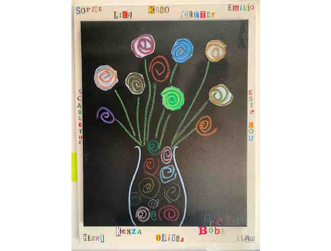 This artwork is a reflection of activities done in class by the students. They made the flowers for this bouquet with spirals, using playdoh and "caterpillars" to handle. These spirals were copied, cut out and traced with oil pastels. Other spiral flowers have been added to the bouquet, traced with oil pastels. Bravo to the children for their work and creativity.