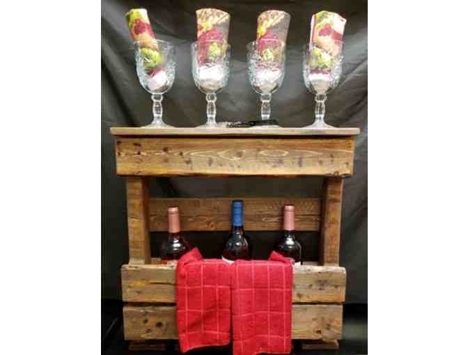 Rustic Pallet Wine Rack w/wine, glasses and more - courtesy Randy and Shaylyn Fredericks