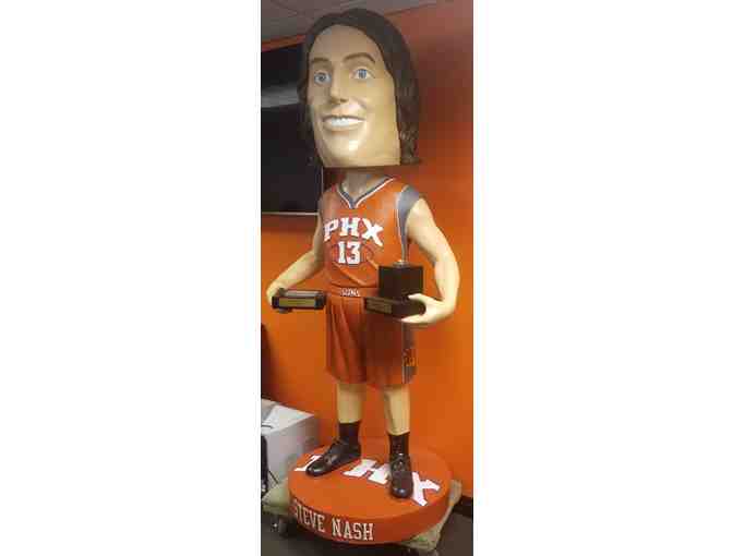 Bid to win this giant Steve Nash bobblehead. This more than lifesize bobblehead is over 7 feet tall and features Steve Nash in a Suns uniform standing on a PHX base. Both of the trophies that he is holding are missing and there are some slight signs of damage on the bobblehead. This is the ultimate collectors item for any Suns and Steve Nash fan.