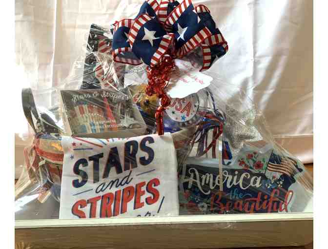 Celebrate Independence Day right with festive collection of party supplies! A wooden tray with the festive makings for the 4th of July: Americana decorations, including a teddy bear, cupcake decorations & spatula and napkins to catch the crumbs.