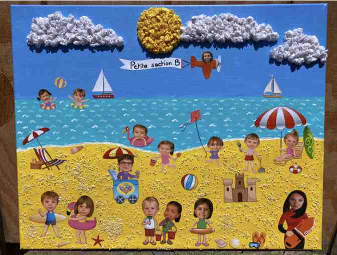 The PSB students made tissue paper balls to create the sun and clouds, and sprinkled beach sand on the painting as a finishing touch. Each student's face is a part of the collage, as well as an item that they chose (sailboat, sandcastle, beach chair, beach ball, seashell, sandals, kite, floatie and airplane).