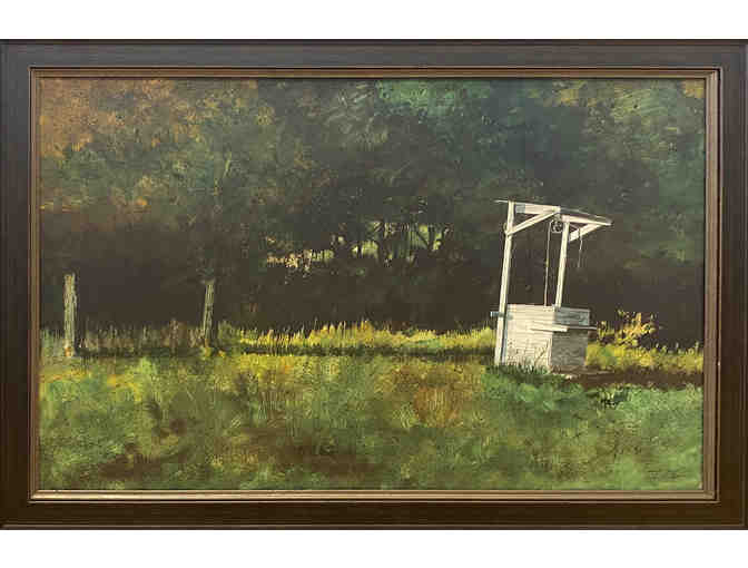 This quiet, serene landscape shares stylistic qualities with watercolors by Pennsylvania born artist Andrew Wyeth.