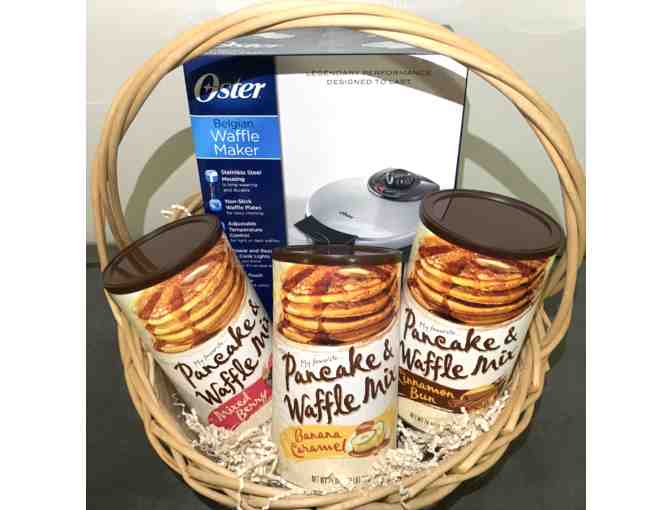 Package includes waffle maker, mixing bowl with spoon and three delicious gourmet waffle mixes!
