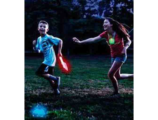 Family game night-- BACKYARD style. This fun-filled package includes outdoor ring toss, badmitton set and LIGHT-UP Capture the Flag game!