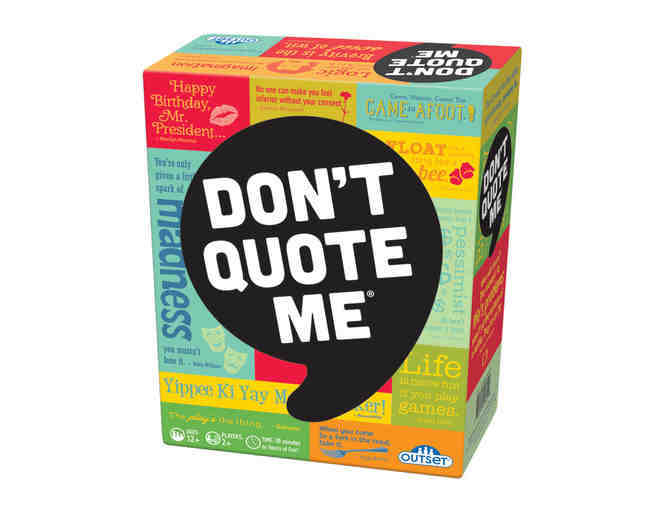 These and many other quotes - 792 to be exact - are yours to uncover in Don't Quote Me. Categories include Pop Culture, Leaders, Movies, Sports, and Literature. Don't know the quote... ask for a clue! Still don't know... ask for multiple choice! Fun and challenging, Don't Quote MeĀ® is great for those who appreciate the power words have to inspire, to irk, to startle, and to amuse. Ages 14+.