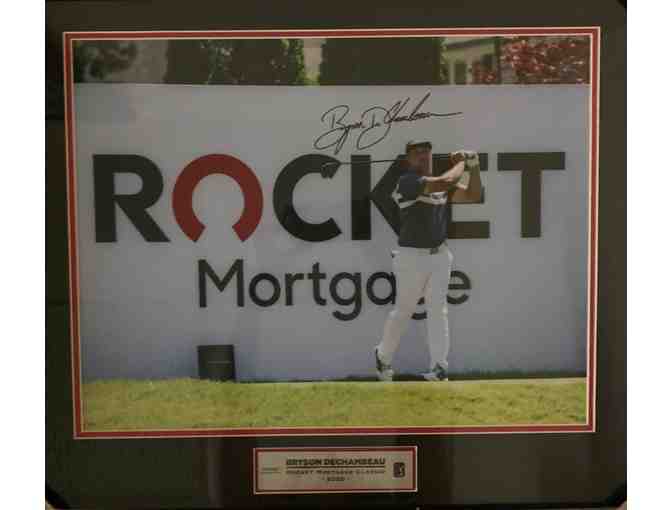 Signed, framed and matted photo of Bryan DeChambeau from the 2020 Rocket Mortgage Classic. Includes metal nameplate. Measures 27.5" x 23.5".