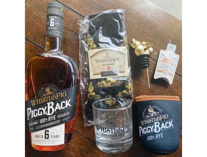 A bottle of Whistle Pig Whiskey, branded glass, branded Koozie, Pig spout, dress socks and old fashion cocktail syrup!