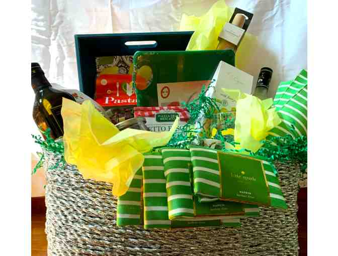 Lemon trees abound along the Amalfi Coast in Italy. This basket will take you on a trip to Italy. Included: decorative lemon-themed tray, olive oil, risotto, 2 lemon-decorated glasses, biscotti, candy, pasta & sauce, Limoncello, rolling pin, cutting board, and bright green Kate Spade placemats and napkins.
