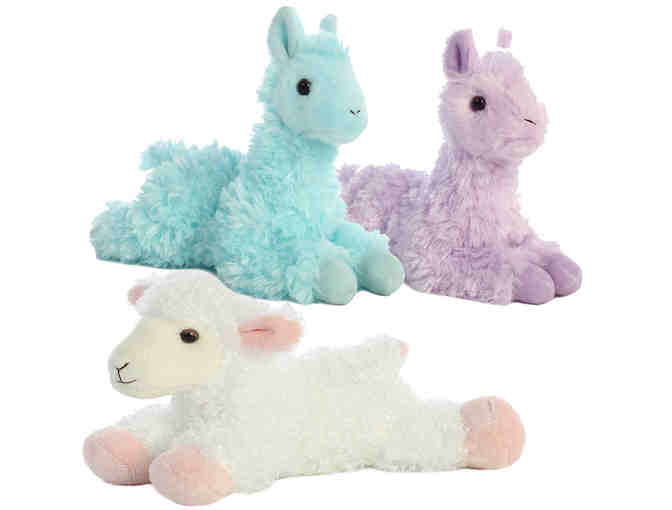 Meet the Pink and Aqua colored Llamas and Lamb. All Aurora brand Flopsie Stuffed Animals. 8" in size and made from quality materials for a soft cuddling experience. Suitable for all ages.