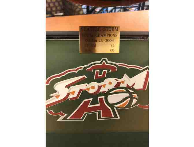 The placard inside the case reads, "SEATTLE STORM, WNBA CHAMPIONS, October 12, 2004, Storm 74 Sun 60."