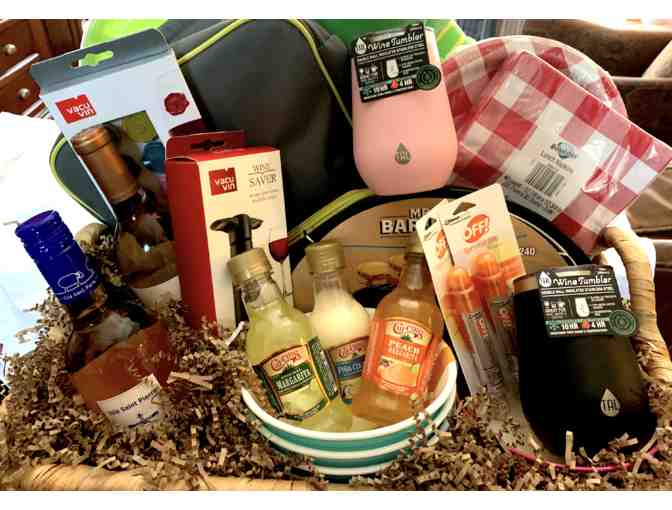 Outfit your outdoor feast with the essentials needed for a festive outing. Basket includes: picnic bag with plates & cutlery, patriotic straws and other paper products, 2 blankets, 4 bottles of wine with accessories, outdoor candles, bug spray & a grill to go.