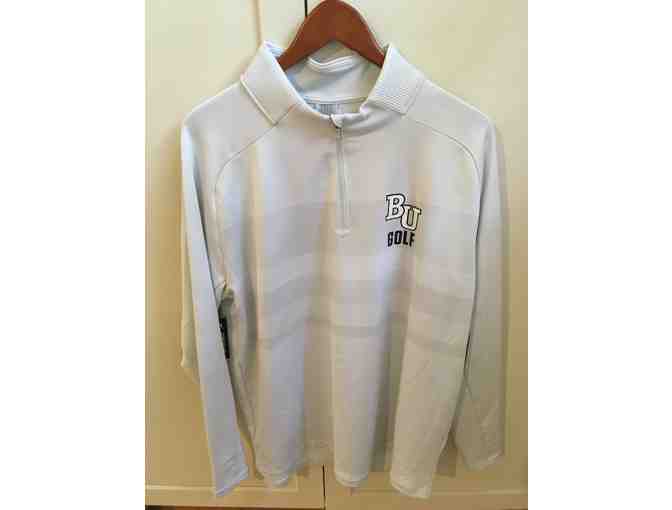 White Nike XL BU Golf Men's Pullover with "BU Golf" logo. Nike dry fabrics move sweat from you skin for quicker evaporation - helping you stay dry, comfortable and focused on the task at hand (DRI-FIT technology)